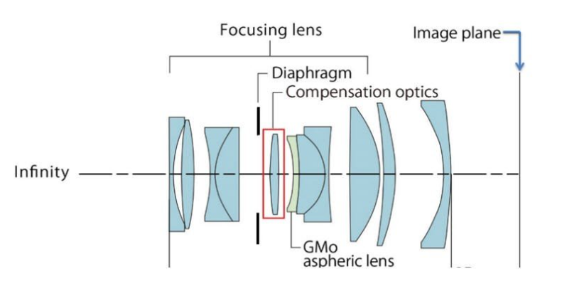Ống kính được cấu tạo từ 11 thấu kính trong 9 nhóm, trong đó có 1 thấu kính phi cầu GMo giúp giảm quang sai cầu và giữ hình ảnh sắc nét trên toàn khung hình.